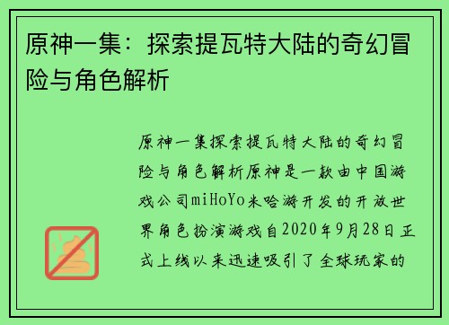 原神一集:探索提瓦特大陆的奇幻冒险与角色解析
